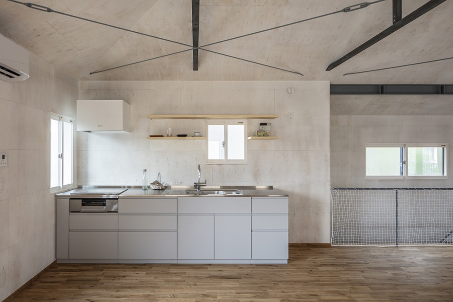 杉並区成田西 地下1階付き地上2階建て 約35帖のリビングダイニングキッチンは、思い思いの使い方を許容してくれる空間。また、今回、空間の中に2台の大きなテーブルも設えました。組み合わせ次第でこの大らかな空間の表情も、使い方も変わります。 カメラマン:Satoshi Asakawa