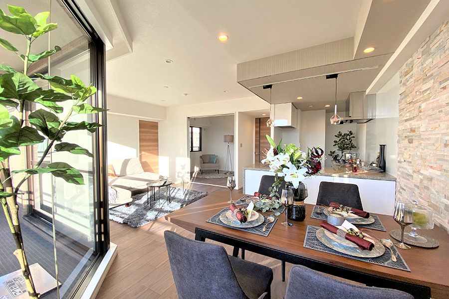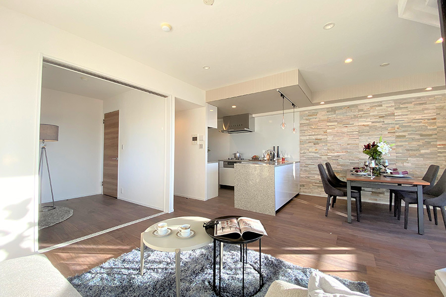 システムキッチンをL型にして、モダンで広々としたLDKを演出。
