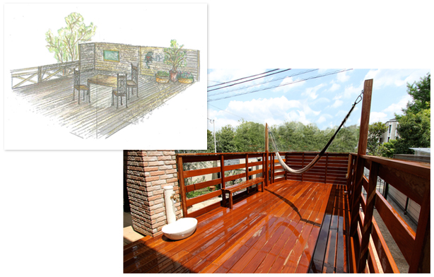 ある本に、お宅のお庭にリビングから続くようにウッドデッキを作られたという写真が載っていて。それを見たときから、いつか家を建てるときにはこんなふうにしたい!と思っていました。