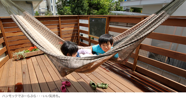横の壁に這わせる木も丁度いい間隔になるように、工事中に調整しながら進めていただきました。 実はこのハンモックを釣れるというアイデアも、工事が着工してから見た雑誌がヒントになっているんです。施工中でしたし、いまさら無理かなと思いつつ大工さんにご相談したのですが、「出来ますよ!」と快く応じていただけて、とても嬉しかったです。